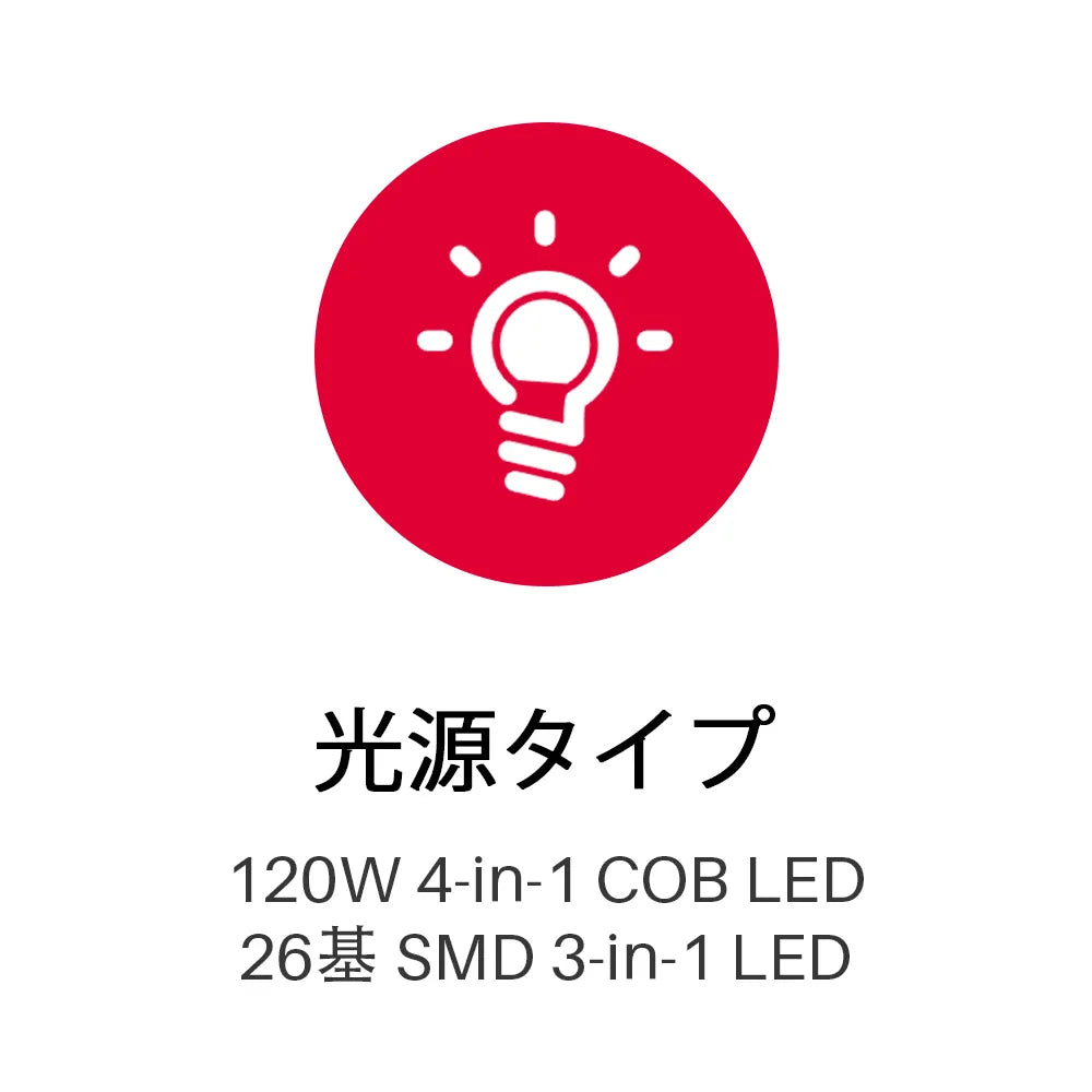 - タイプ:1×120W 4-in-1 COB LED + 26個のSMD 3-in-1 LED