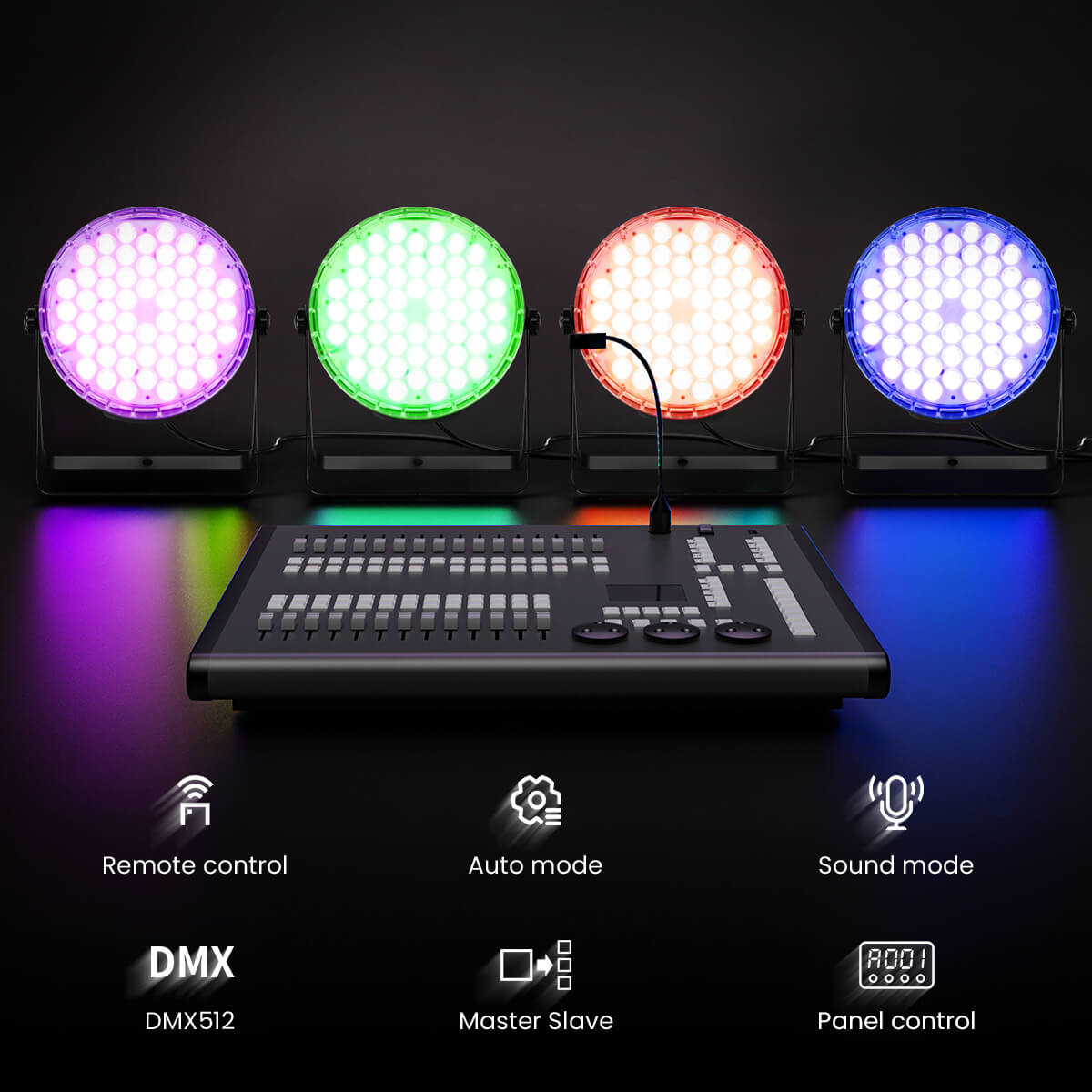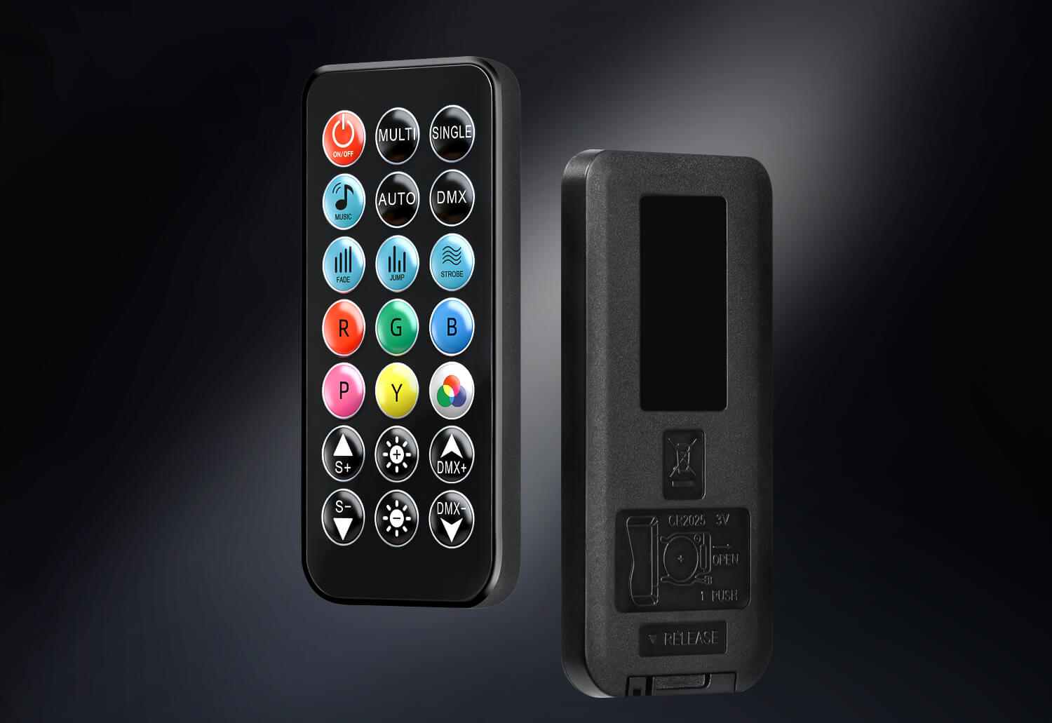 Easily control the light without extra cables or a console. The infrared remote allows instant color switching, brightness adjustment, and mode selection between auto and sound-active operation, offering wide range and fast response for DJs, beginners, and small event setups.