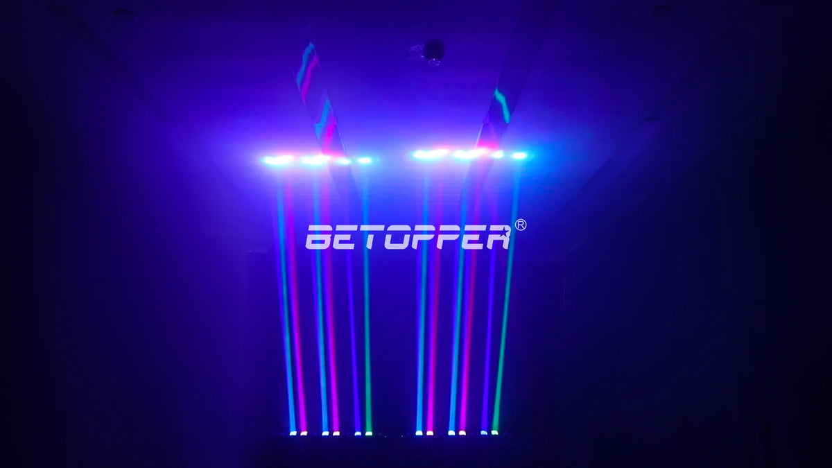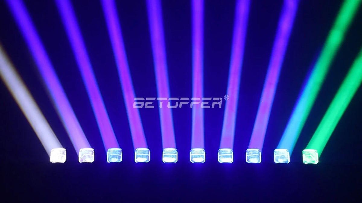 Betopper 10×15W RGBWビームムービングライトは、10個の15W 4in1 RGBW LEDを搭載し、鋭くクリアな直線状のビームを放射します。ファンレス設計で静音性に優れ、静かな環境でも快適に使用可能です。DMX512、RDM、オート、サウンドアクティブ、マスター・スレーブ制御に対応し、7、13、43CHのモード切替が可能。32ビットリニア調光と1~30Hzの高速ストロボ、Y軸ムーブ機能も搭載し、多彩な演出に柔軟に対応します。コンパクトな筐体で設置も簡単、ライブ、クラブ、結婚式、展示会、舞台演出など幅広いシーンに最適です。