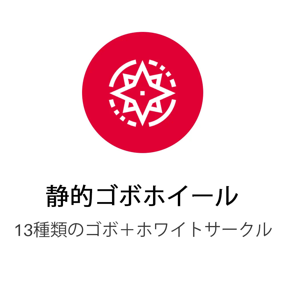 - 固定ゴボホイール:11種類の標準ゴボ + 3種類のガラスゴボ + ホワイトサークル