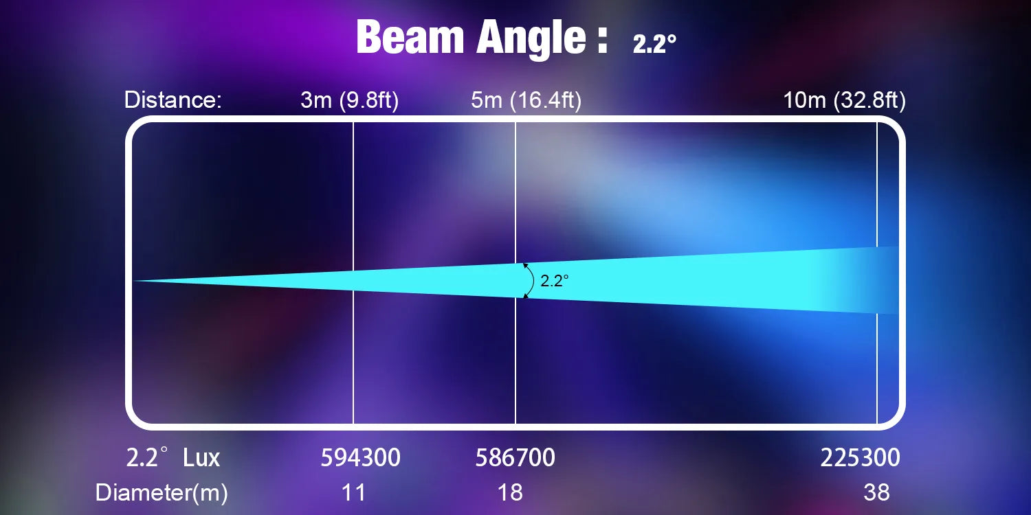 *照度とは、光が物体の表面をどれだけ明るく照らしているかを表す数値です。586,700ルクスは、5メートル離れた場所でも非常に明るく照らすことができるレベルで、大規模なイベントやステージ演出に最適です。