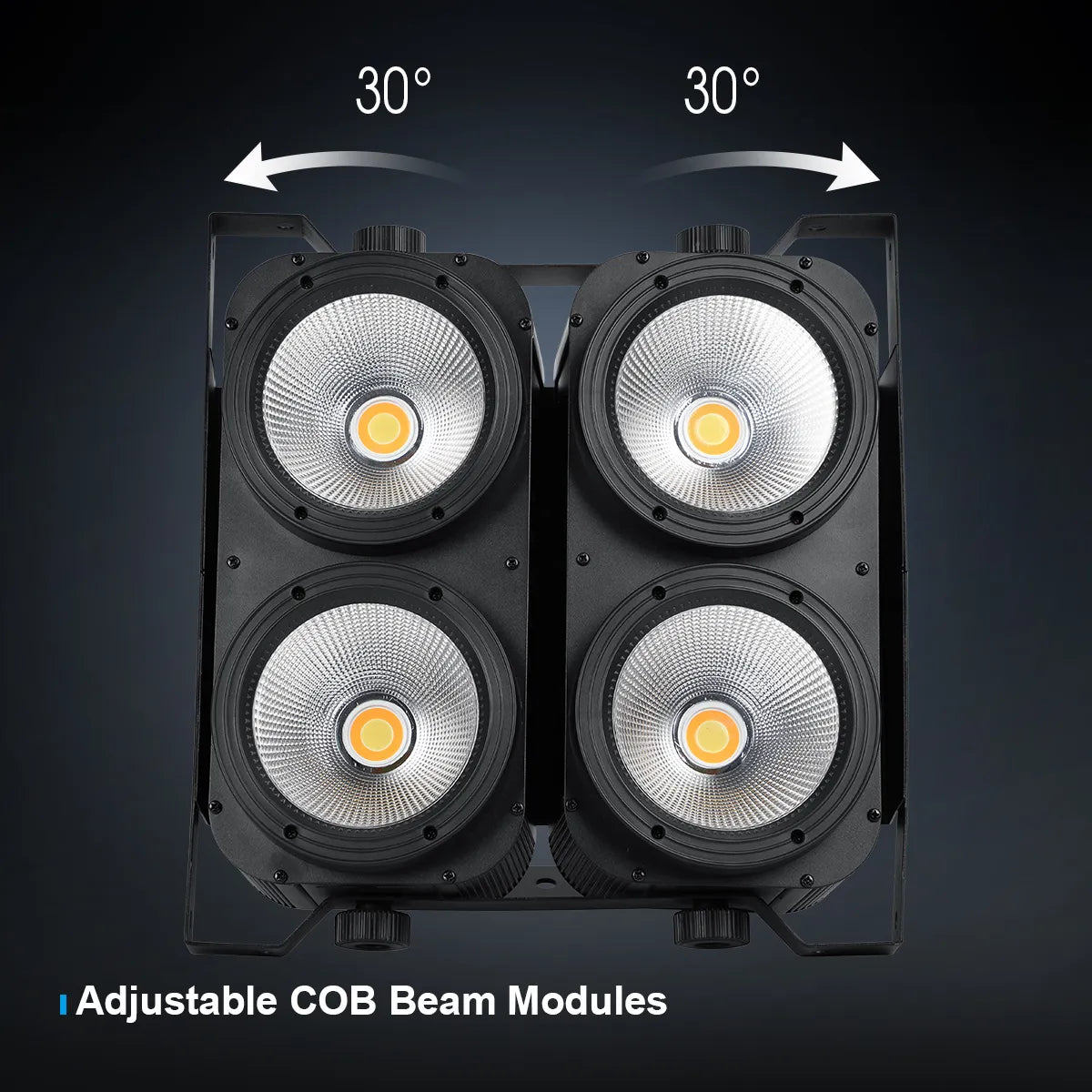 4基のCOB LEDは左右30°まで角度調整が可能で、広範囲を照らすワイドな照明から、中央に集中したライティングまで自在に対応します。