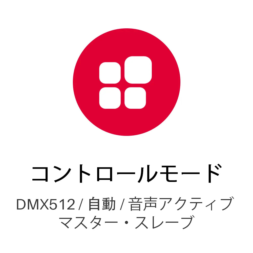 - 制御モード:DMX512、オート、音声アクティブ、マスター・スレーブ