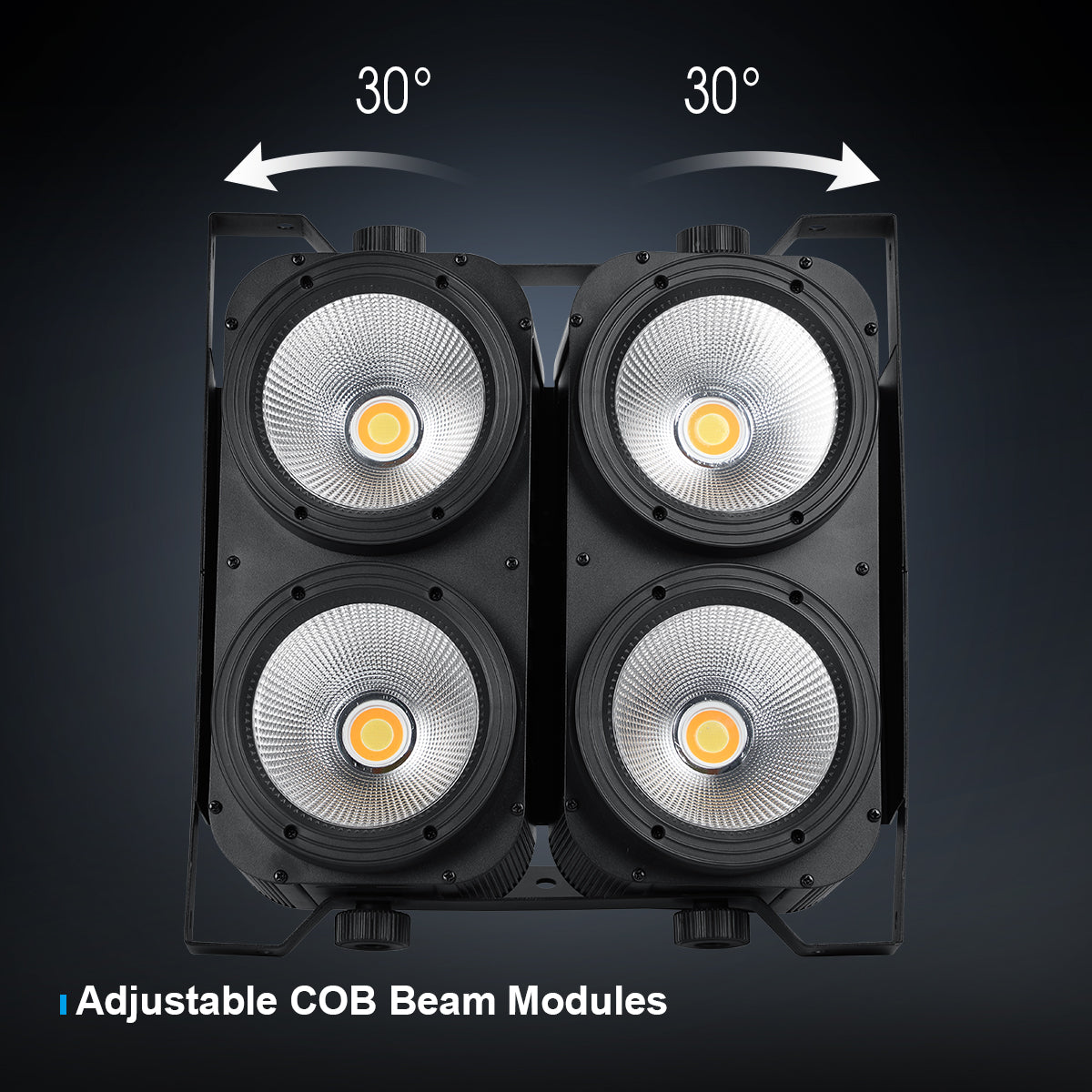The four COB LEDs can be angled 30° left or right, allowing broad illumination coverage or a more concentrated central lighting, delivering flexibility for complex stage lighting needs.